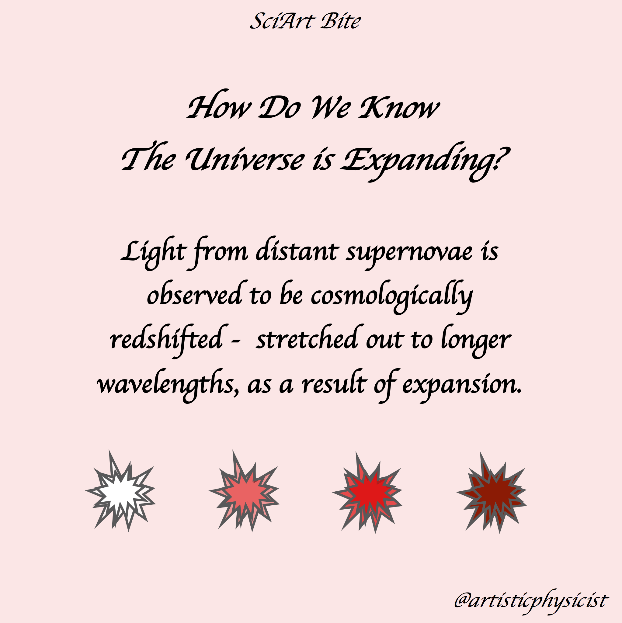 This painting visualises some of the observational evidence for the existence of dark energy – in particular the expansion of the universe and cosmological redshift.